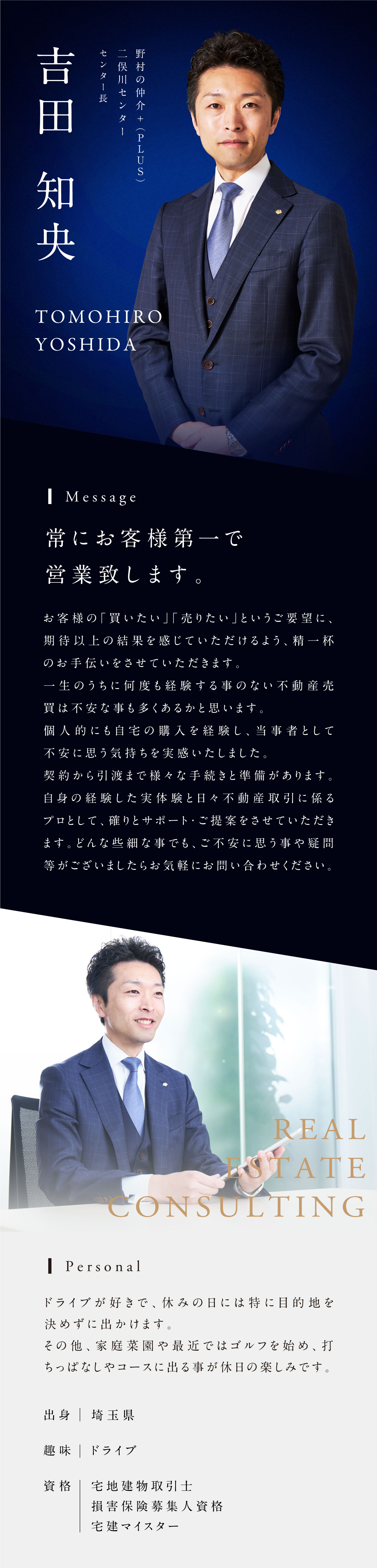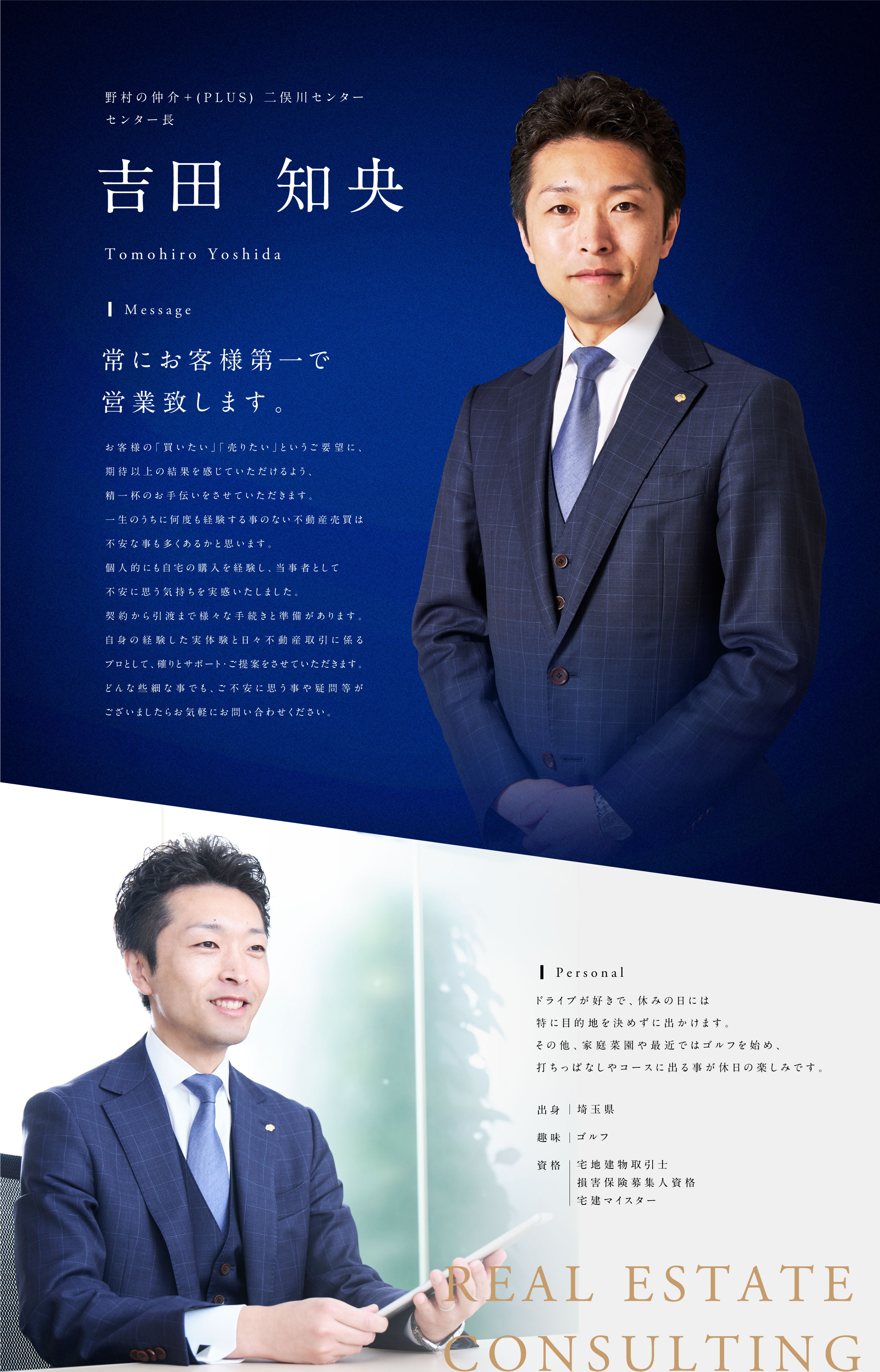 この度は大変お世話になりました。吉田様には売却と購入の両方についてご担当頂きましたが、全てが問題なく、完璧に進める事が出来、大変感謝しております。特に売却に関しては、購入よりもより一層神経を使いましたが、こちらの要望だけでなく、市場の動向や当該エリアの売却実績等から適切な金額をアドバイスして頂けた事で、結果的に短期間で売却する事が出来ました。細かい質問に対してもいつも真摯に、かつスピーディーに対応して頂けた事も大変感謝です。今回、吉田様に担当して頂けて本当に良かったです。今後とも宜しくお願い致します。